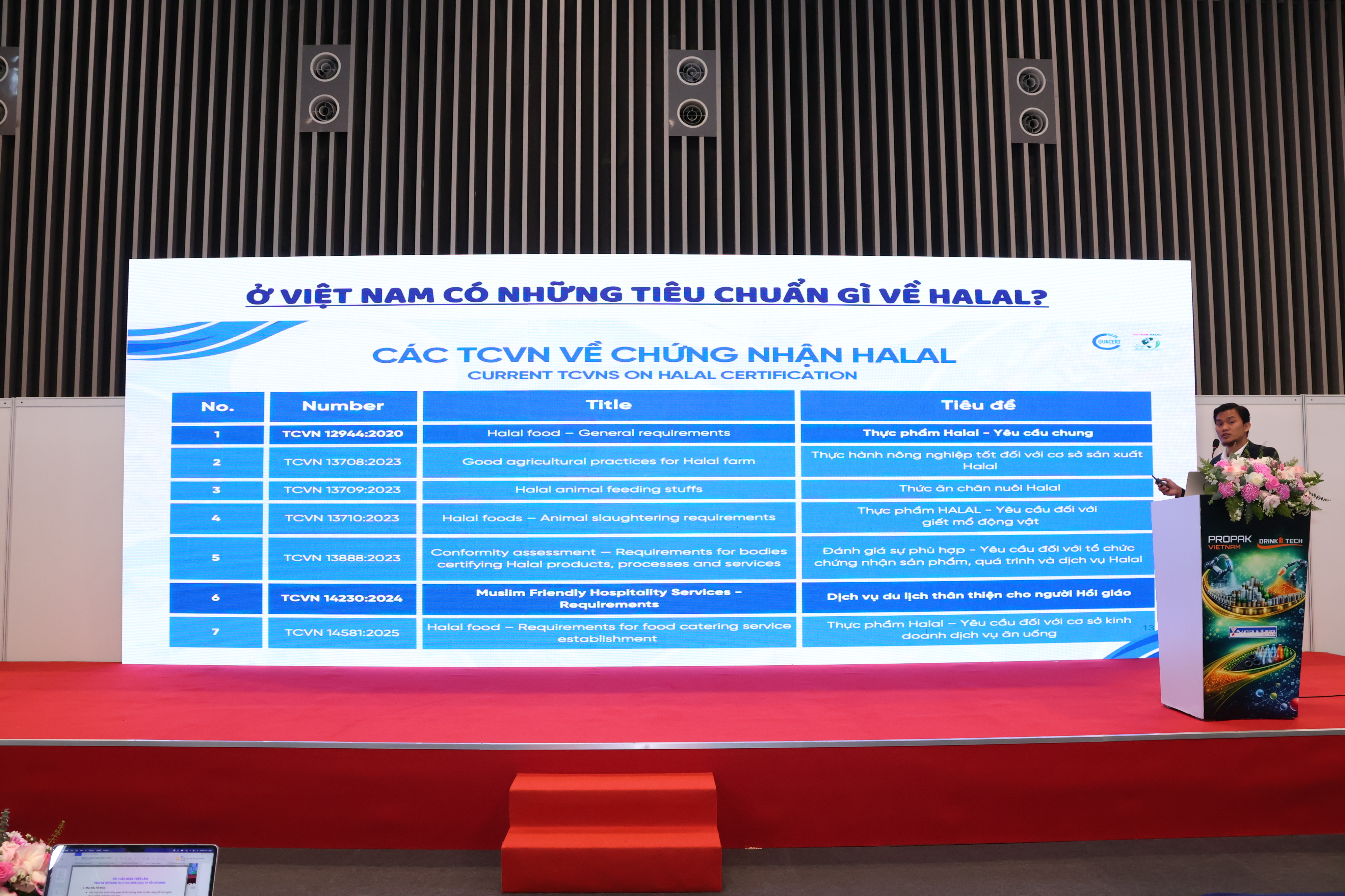 Ông Trần Quốc Dũng - Giám đốc Trung tâm Kỹ thuật Tiêu chuẩn Đo lường Chất lượng 3 (người trước đây là Giám đốc Trung tâm Chứng nhận Phù hợp QUACERT, đơn vị được giao thành lập Trung tâm Chứng nhận Halal Quốc gia) cho biết, Việt Nam tuy tiếp cận với lĩnh vực Halal muộn nhưng đang thúc đẩy rất nhanh. Đến nay, Ủy ban Tiêu chuẩn Đo lường Chất lượng Quốc gia (Ủy ban TĐC), Bộ Khoa học và Công nghệ đã ban hành 7 tiêu chuẩn quốc gia (TCVN) cho ngành Halal bao gồm các khâu quan trọng trong chuỗi cung ứng như: Tiêu chuẩn thức ăn chăn nuôi; Tiêu chuẩn thực hành nông nghiệp tốt; Tiêu chuẩn về giết mổ động vật; Tiêu chuẩn chung về thực phẩm...Đặc biệt là Tiêu chuẩn du lịch thân thiện cho người Hồi giáo; Tiêu chuẩn bếp ăn Halal; Tiêu chuẩn đối với tổ chức chứng nhận Halal. Ủy ban TĐC cũng đã thành lập Trung tâm Chứng nhận Halal quốc gia.