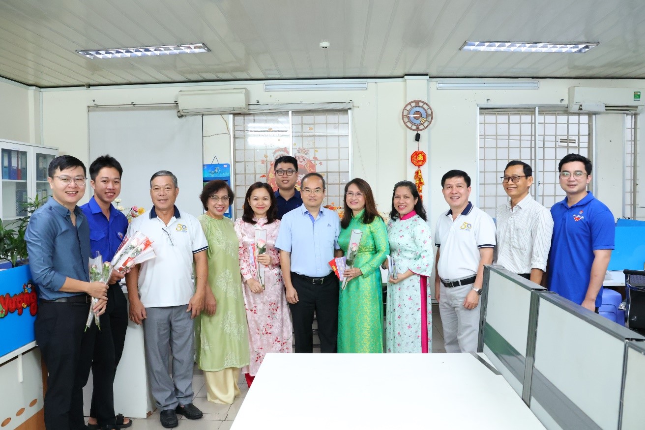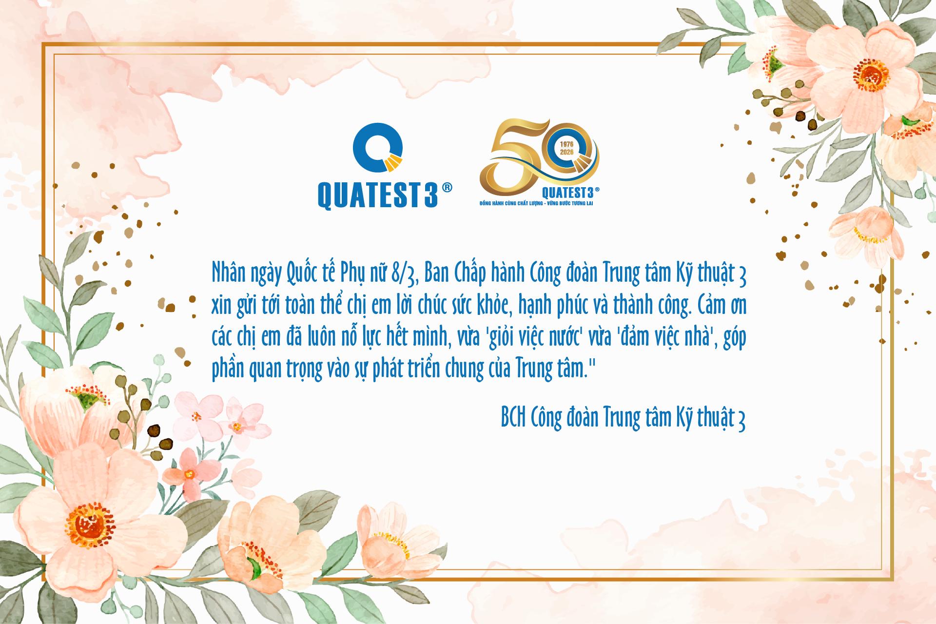 Hòa vào không khí vui vẻ của Ngày Quốc tế Phụ nữ 8/3, ngày 06/03/2026, Đảng ủy, Ban Giám đốc, Ban Chấp hành Công đoàn và Đoàn Thanh niên Trung tâm Kỹ thuật Tiêu chuẩn Đo lường Chất lượng 3 (QUATEST 3) đã đến các điểm làm việc của Trung tâm chúc mừng cán bộ viên chức, người lao động nữ đang công tác tại Trung tâm.