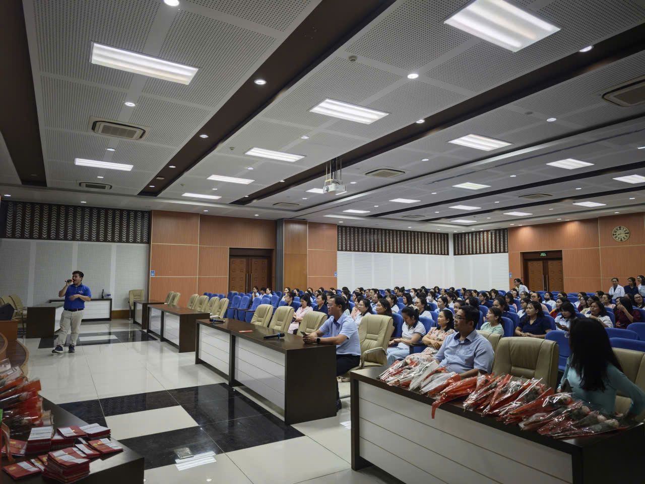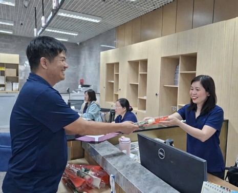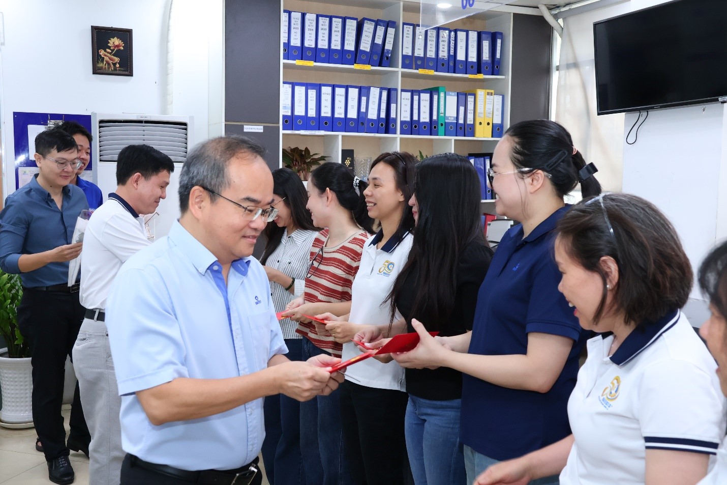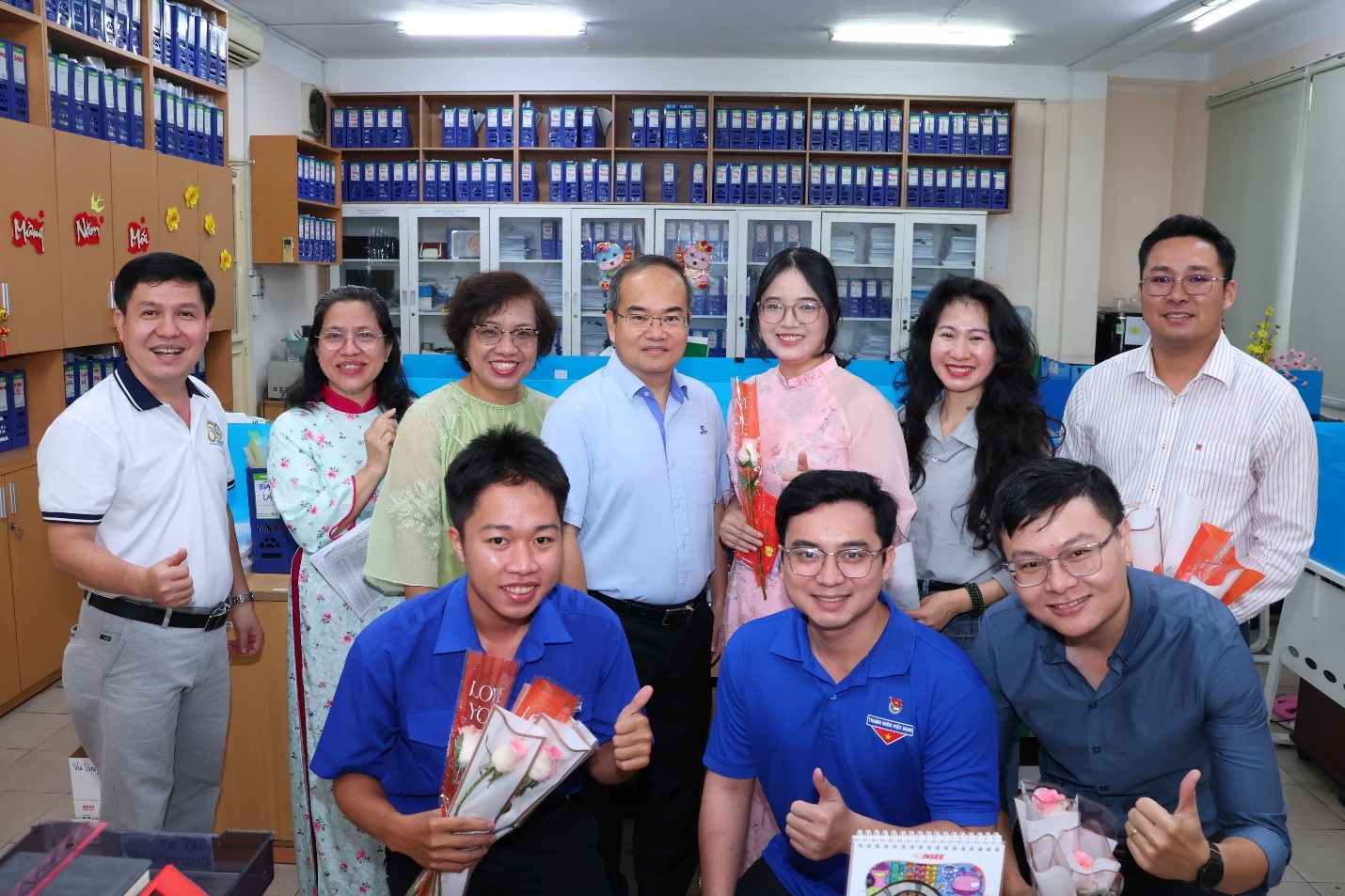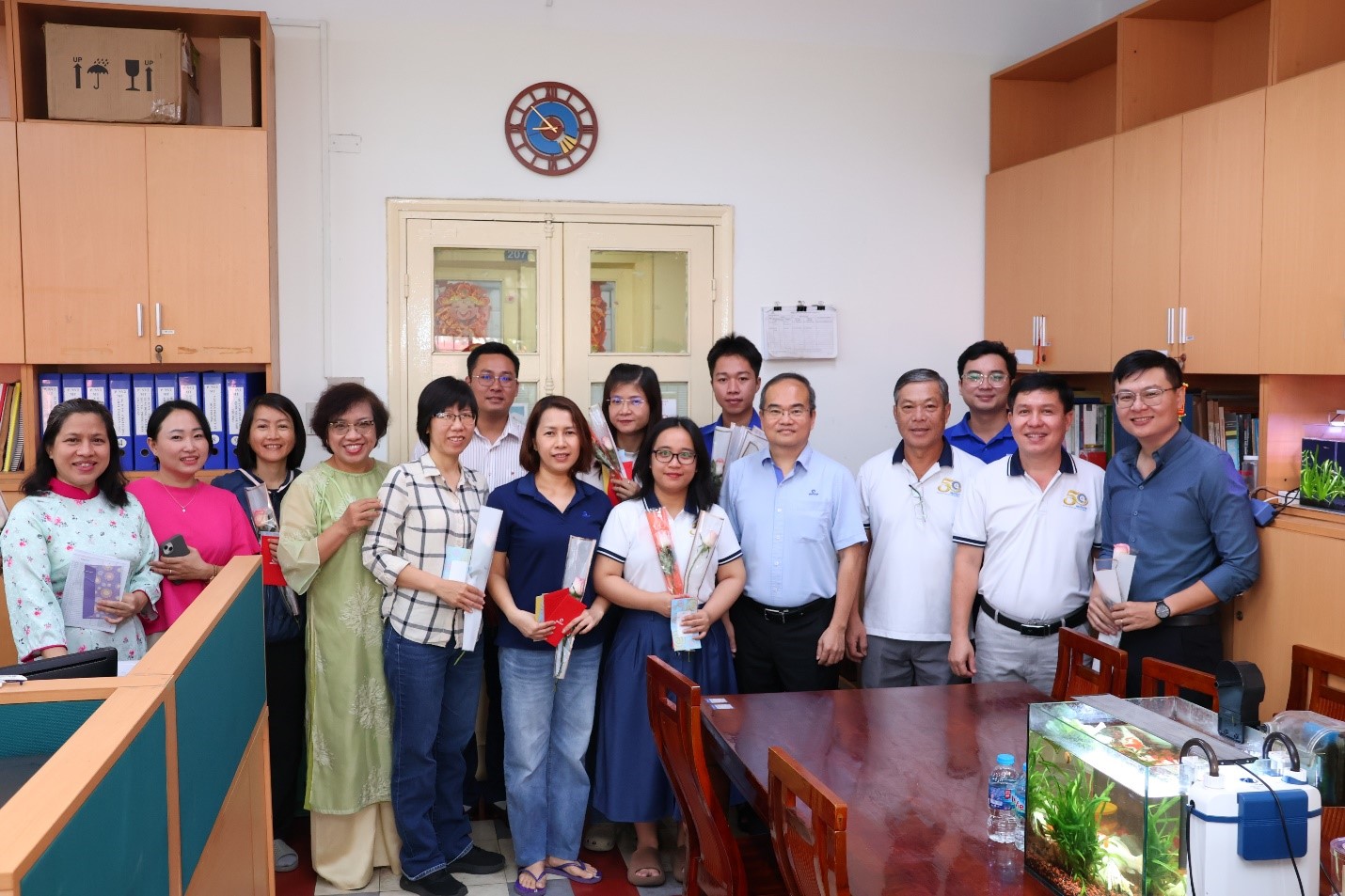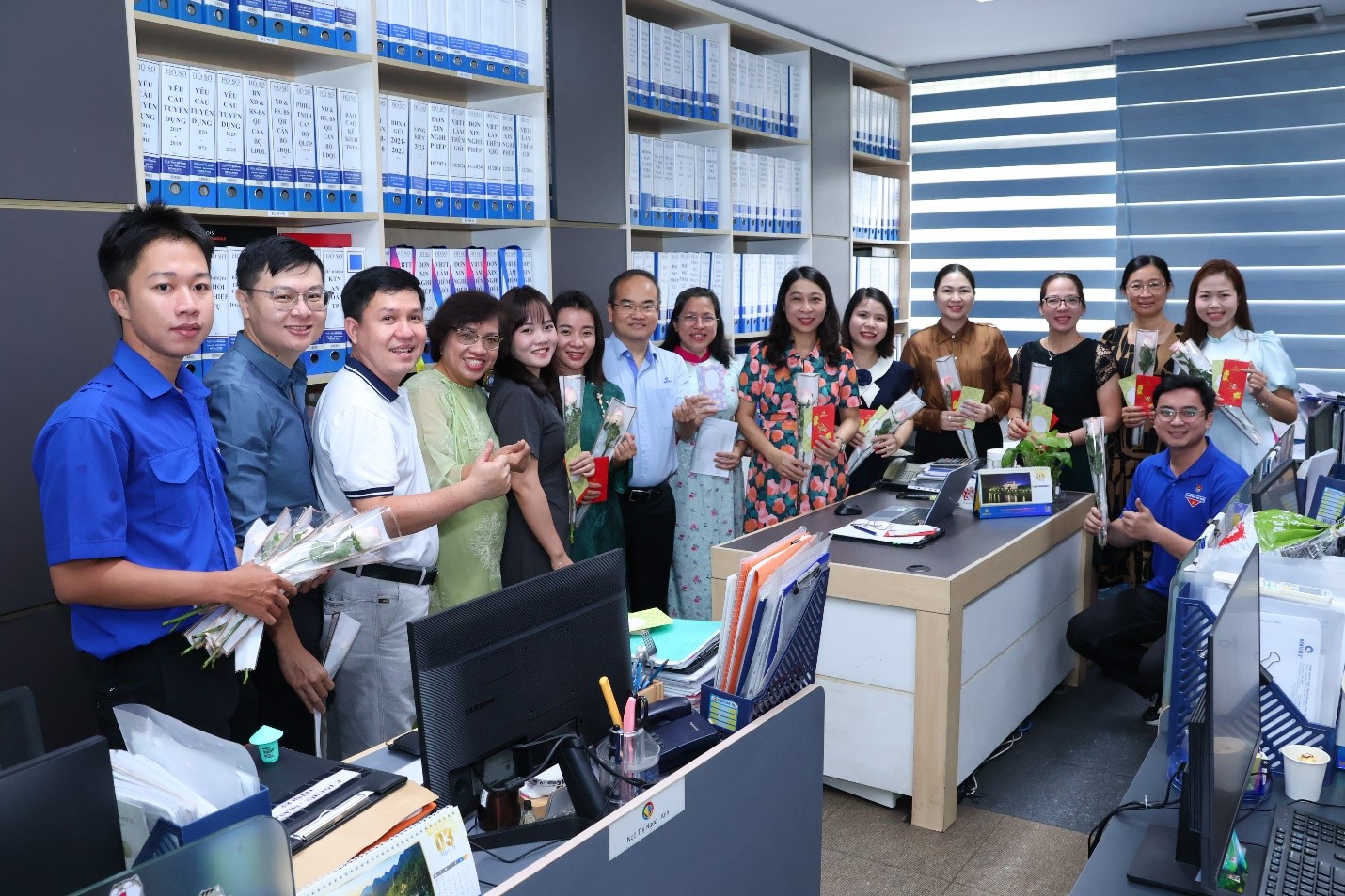 Ông Trần Quốc Dũng - Giám đốc Trung tâm đại diện Đảng ủy và BGĐ cùng các đại diện của Công đoàn, Đoàn Thanh niên Trung tâm trao tặng hoa và quà cho các bộ viên chức, người lao động làm việc tại địa điểm 49 Pasteur, phường Sài Gòn, Thành phố Hồ Chí Minh
