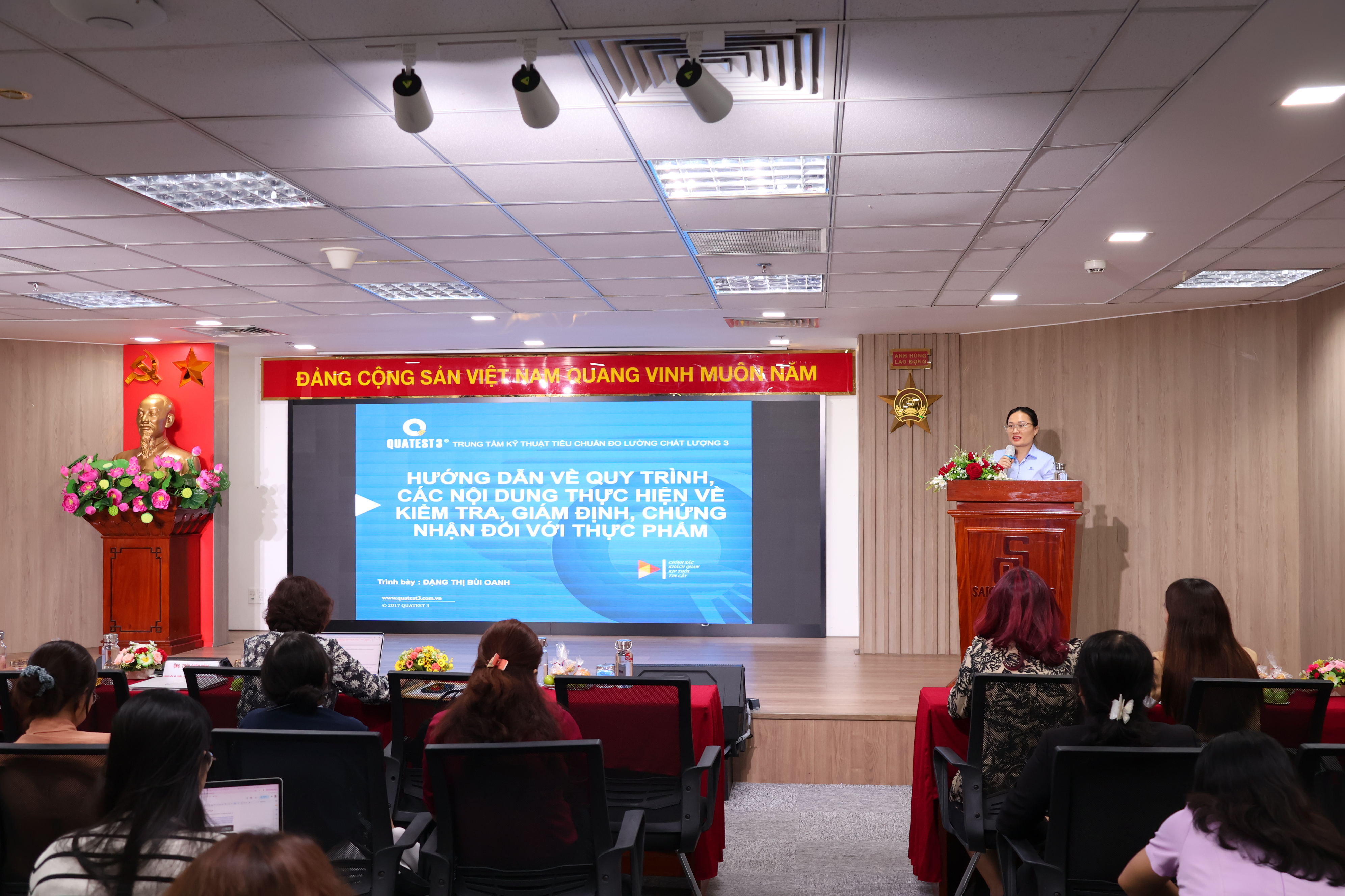 Nhằm hỗ trợ các doanh nghiệp QUATEST 3 về quy trình, các nội dung thực hiện về kiểm tra, giám định, chứng nhận đối với thực phẩm, phía QUATEST 3 còn có bài trình bày từ bà Đặng Thị Bùi Oanh, là chuyên gia về nông sản, thực phẩm và môi trường (Phòng nghiệp vụ 3) với nhiều thông tin thiết thực và hữu ích. Chi tiết nội dung bài trình bày của bà Đặng Thị Bùi Oanh xem tại đây.