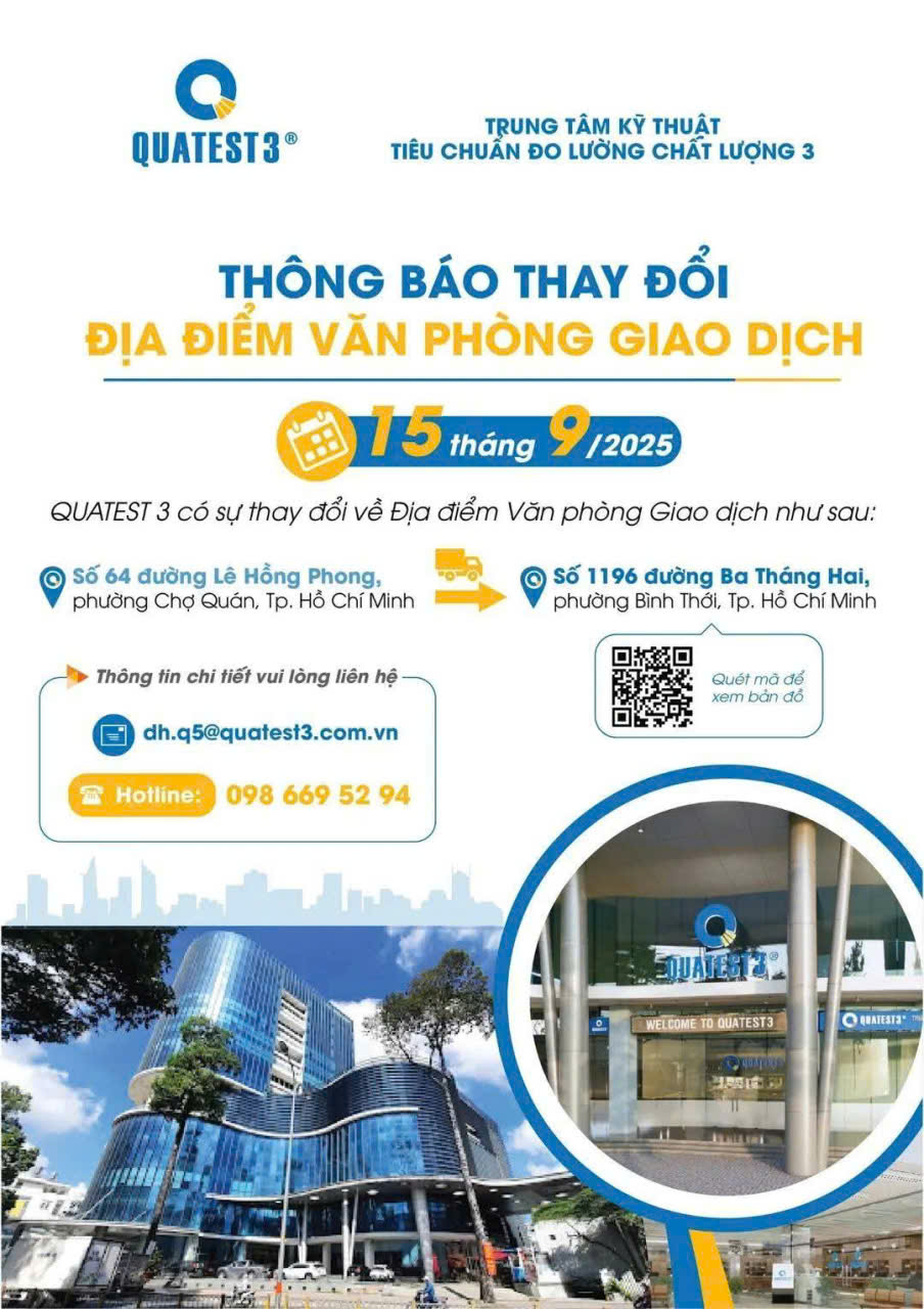 Theo đó, ngày 15/09/2025 QUATEST 3 đã chính thức mở cửa tại địa chỉ mới (1196 đường Ba Tháng Hai, phường Bình Thới, Tp. HCM) để tiếp đón các quý khách hàng.