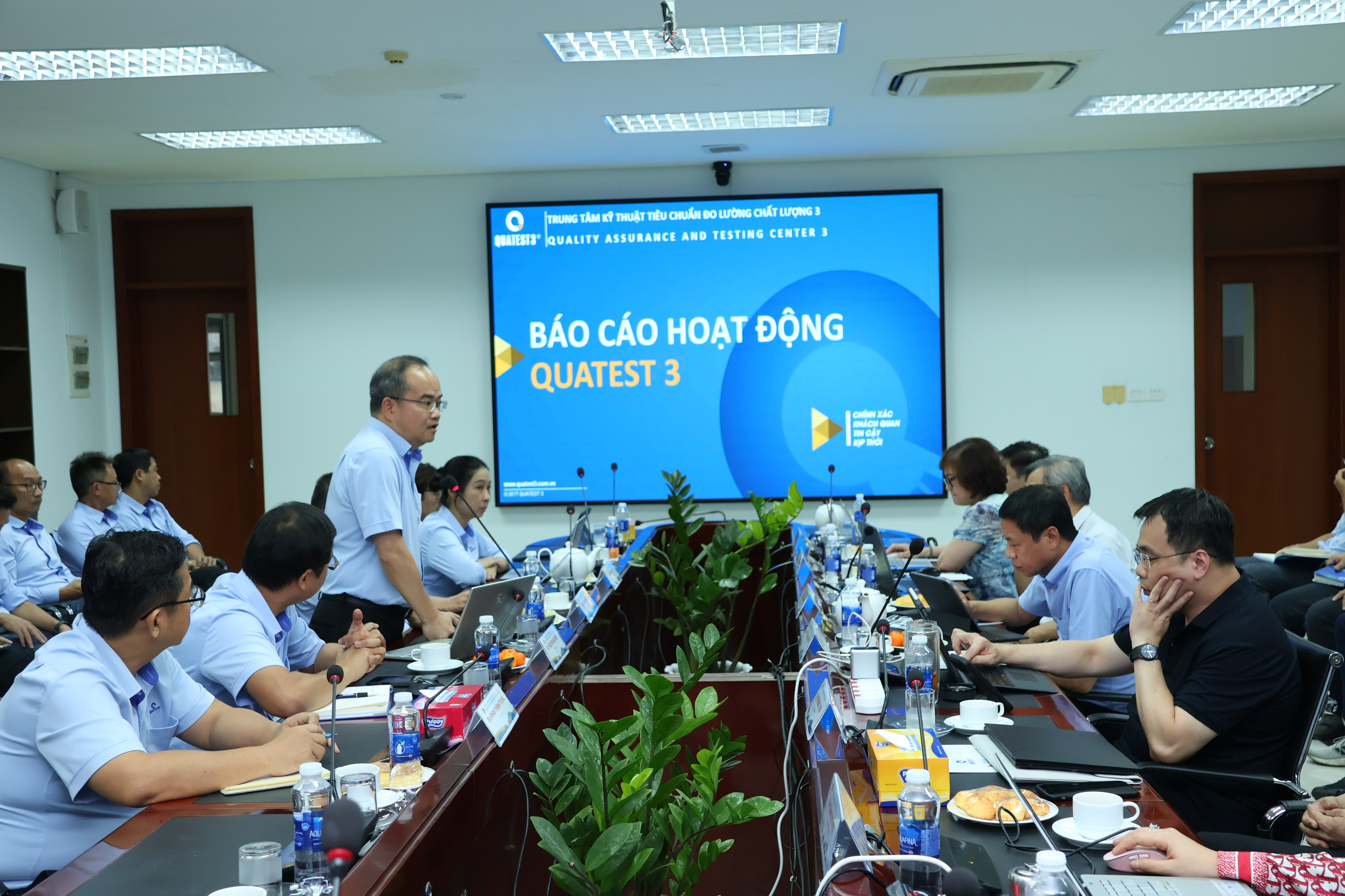 Đồng chí Trần Quốc Dũng – Giám đốc QUATEST 3 báo cáo một số hoạt động trọng tâm của Trung tâm đến Thứ trưởng Bộ và lãnh đạo Ủy ban TĐC