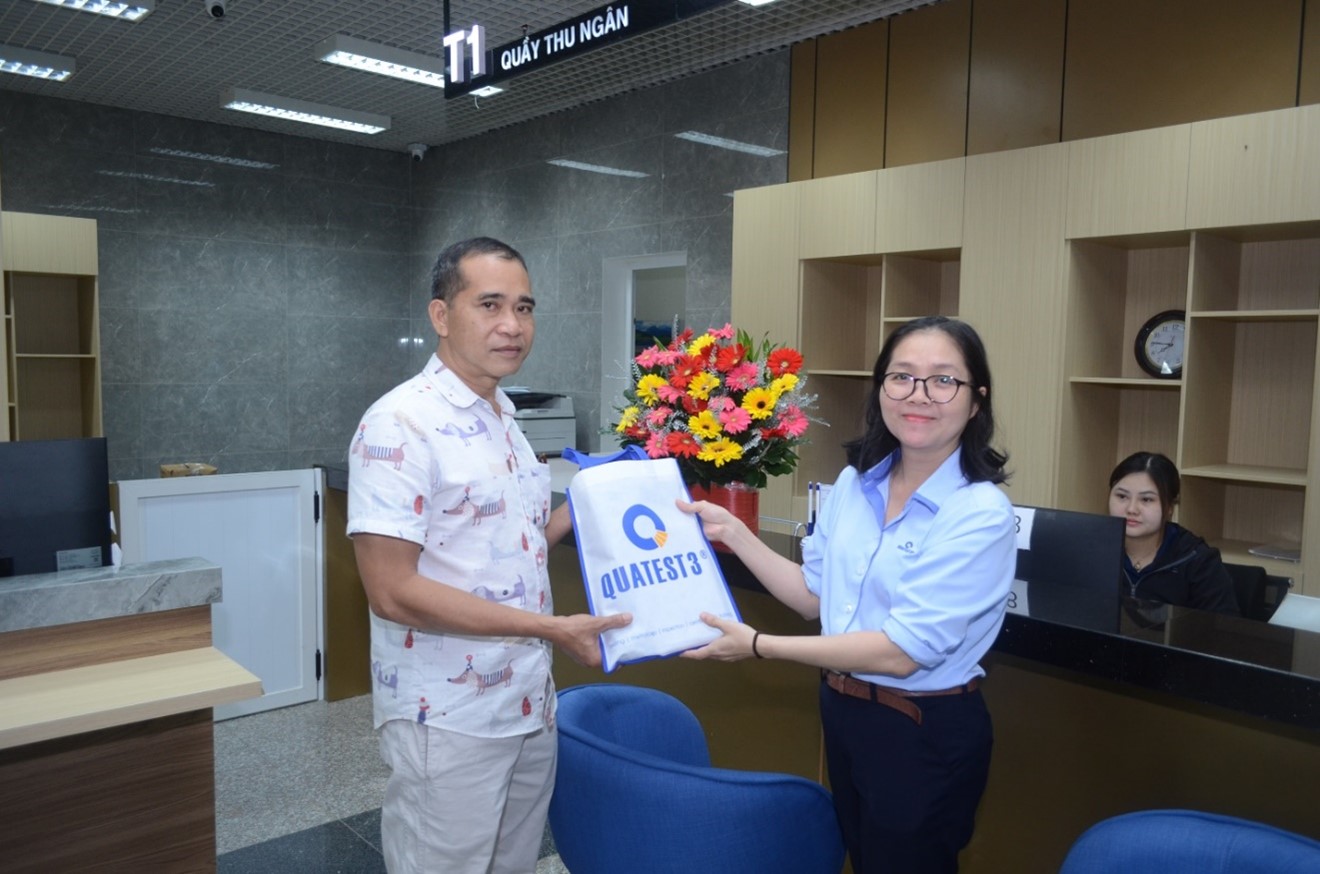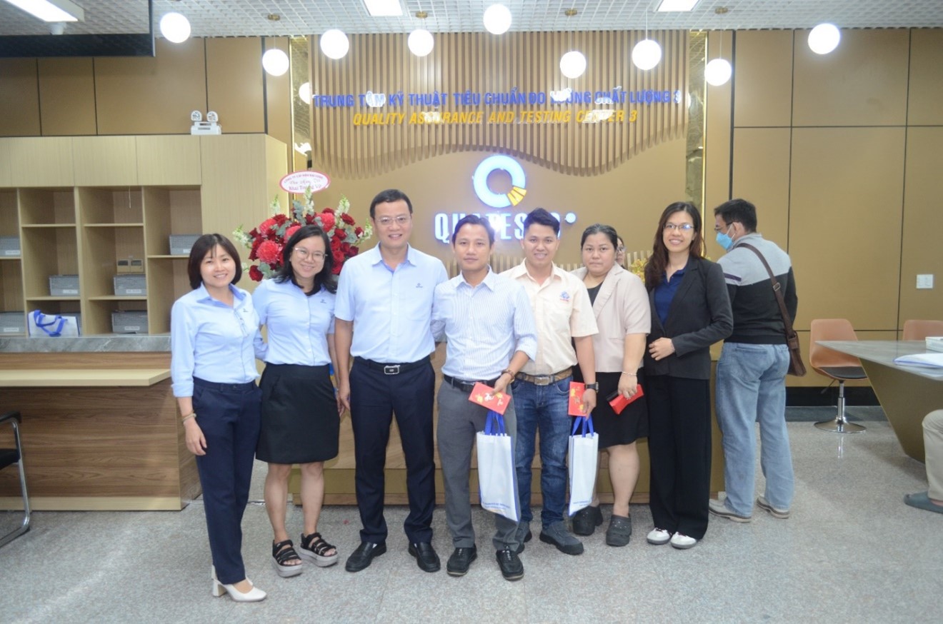 Đại diện từ QUATEST 3: Ông Nguyễn Anh Triết - Phó Giám đốc (đứng thứ 3 từ trái qua) và bà Trần Thị Quỳnh Như - Trưởng phòng Dịch vụ khách hàng (đứng thứ 2 từ phải qua) tặng quà và chụp hình lưu niệm cùng khách hàng